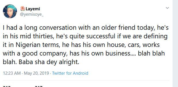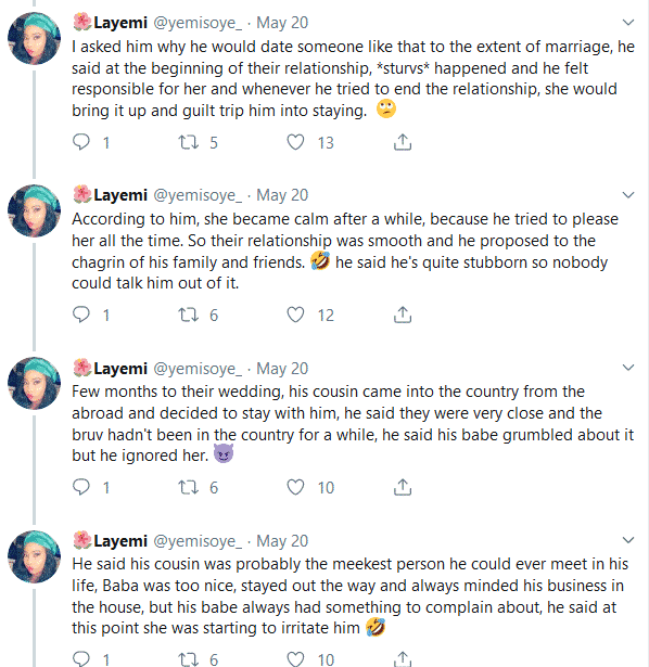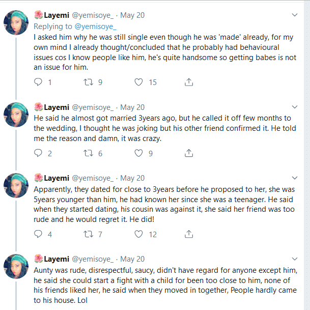 Layemi had engaged in a conversation with the man who is her friend. She was surprised he wasn’t married yet and was shocked when he told her his story.