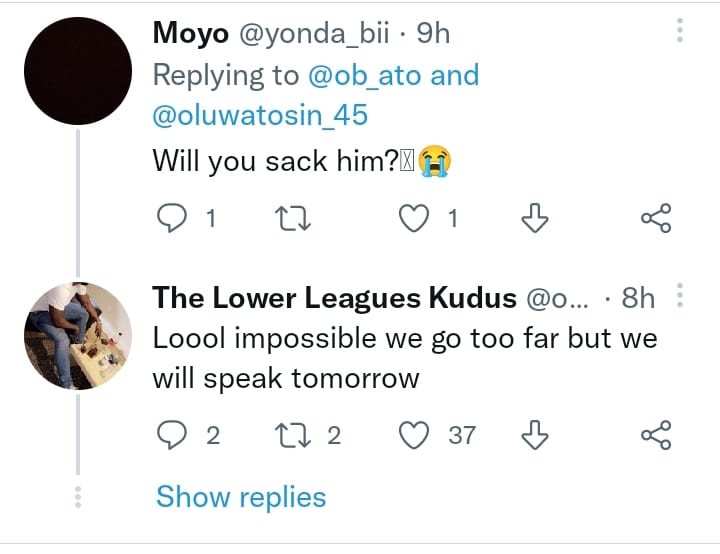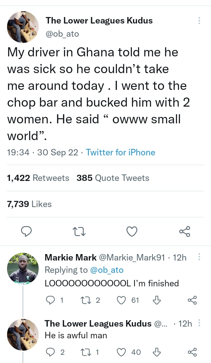 “My driver in Ghana told me he was sick so he couldn’t take me around today . I went to the chop bar and bucked him with 2 women. He said “ owww small world”,”
