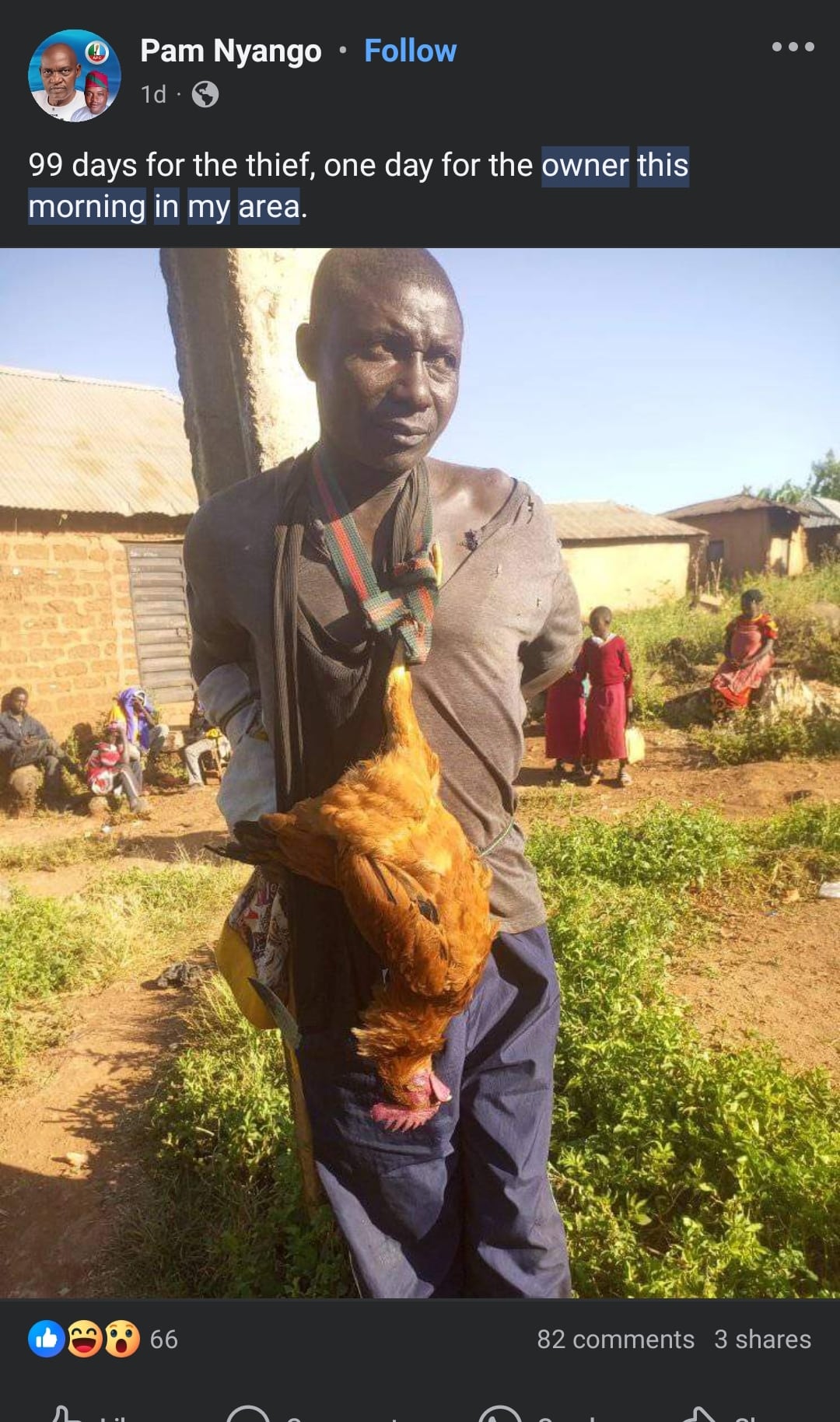 In a show of public reprimand, the man was made to stand by a pole with the chicken tied around his neck to serve as a warning to him and others.