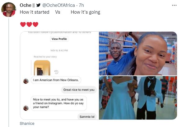 A Twitter user identified by his handle as @OcheOfAfrica is in a blissful state as he ties the knot with an American lady who slid into his DM first.