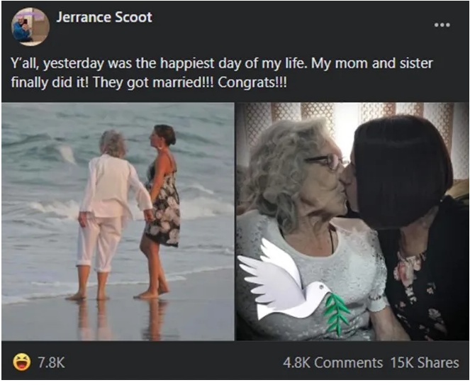 Sharing the absurd news on social media to prove that his mother and sister tied the knot, Jerrance also shared photos of the two women, an elderly one and a middle-aged woman locking lips.