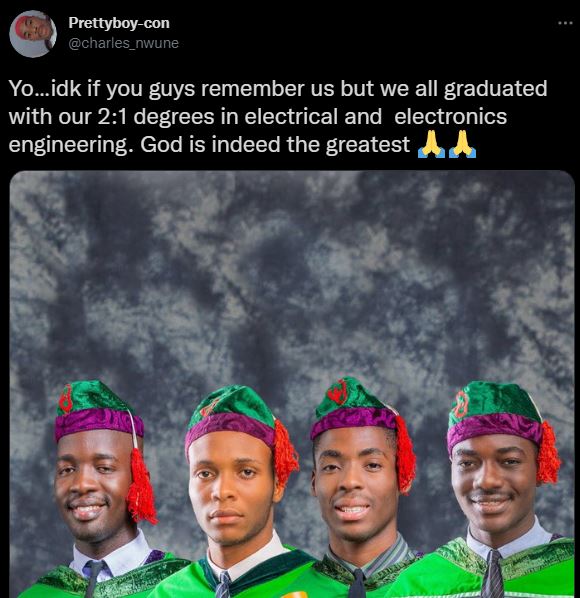 “Yo…idk if you guys remember us but we all graduated with our 2:1 degrees in electrical and electronics engineering. God is indeed the greatest”