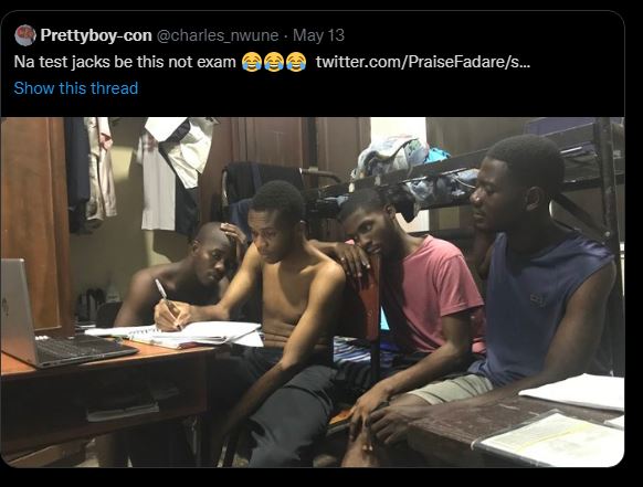 Twitter user identified by his handle as @charles_nwune celebrates his studious university clique whose hard work saw that they all graduate with a Second Class Upper Division degree.