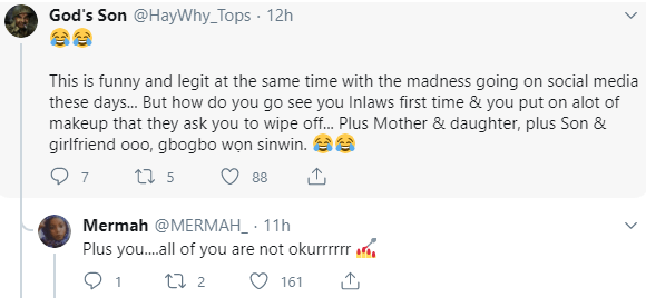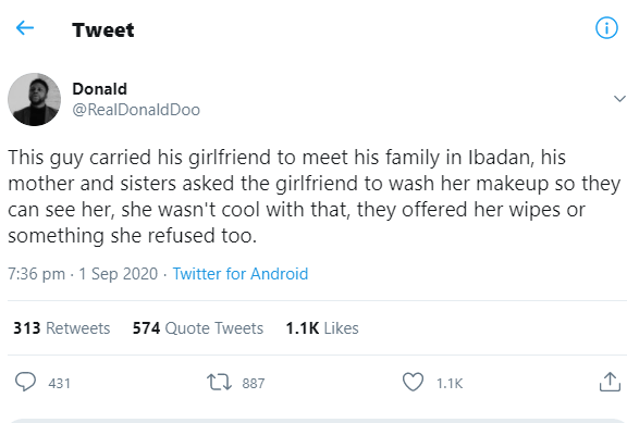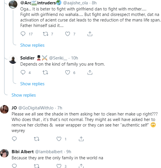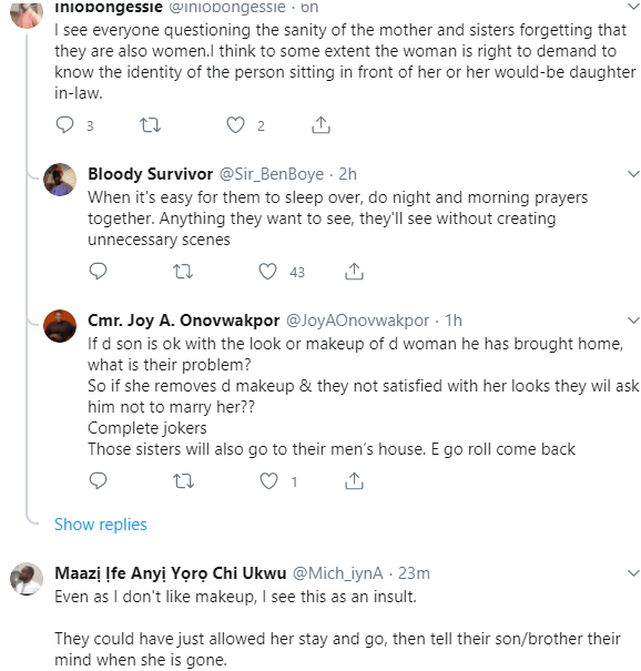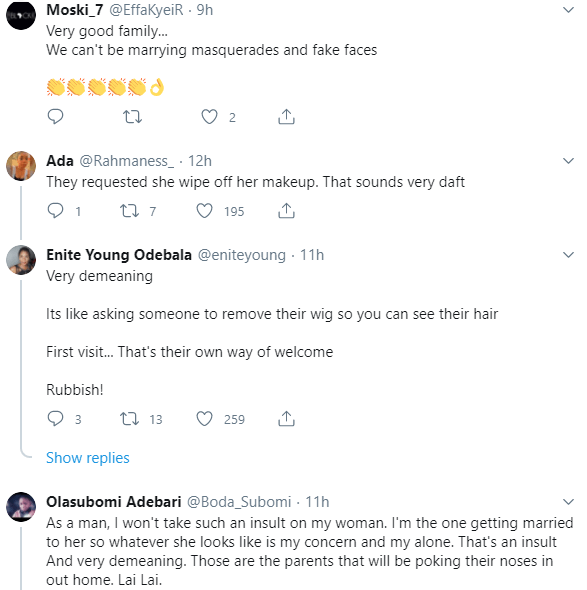 “This guy carried his girlfriend to meet his family in Ibadan, his mother and sisters asked the girlfriend to wash her makeup so they can see her, she wasn’t cool with that, they offered her wipes or something she refused too.”