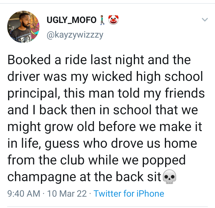 On the micro-blogging platform, he wrote: “I booked a ride last night and the driver was my wicked high school principal, this man told my friends and I back then in school that we might grow old before we make it in life, guess who drove us home from the club while we popped champagne at the back sit? “