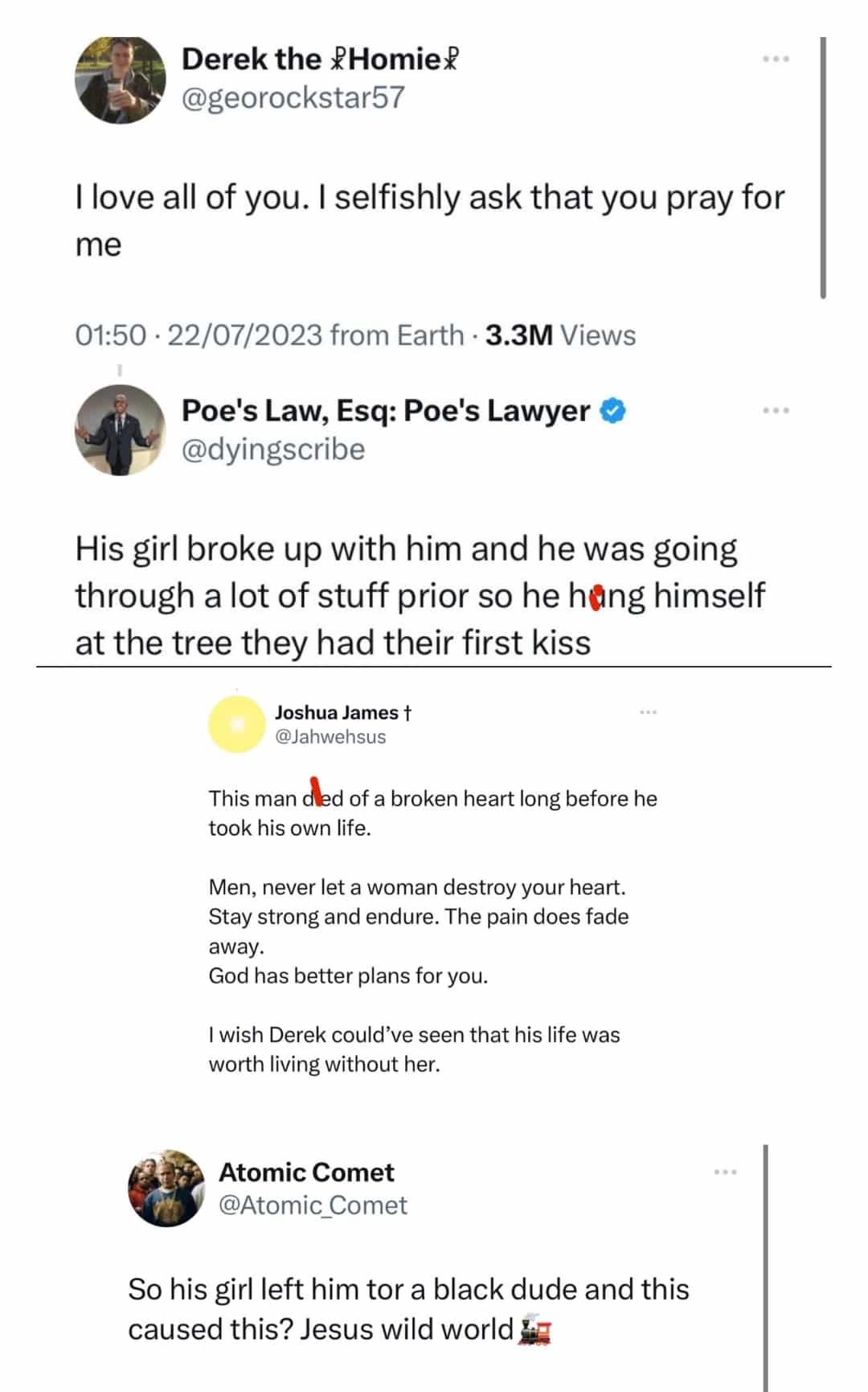 Some screenshots shared online by some close friends show that on July 24, Derek took to his social media page and posted a suicide note to his Twitter account.