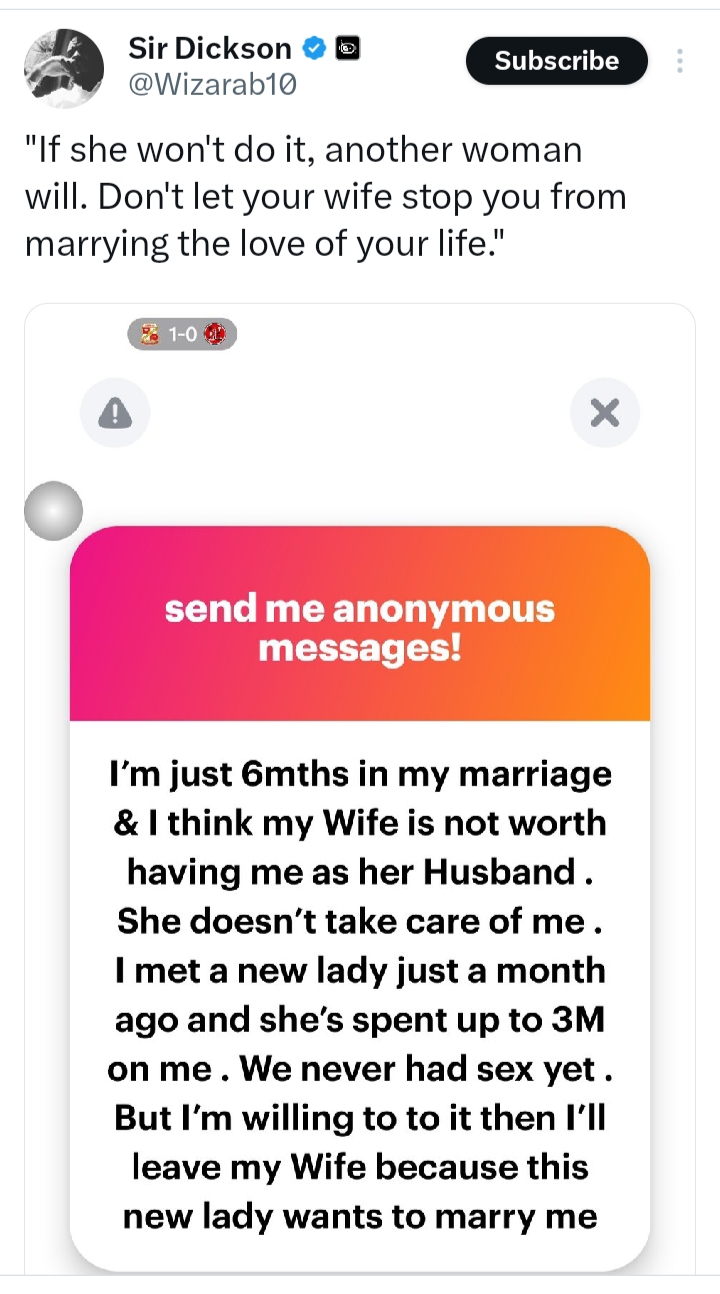“I’m just 6mths in my marriage & I think my Wife is not worth having me as her Husband. She doesn’t take care of me. I met a new lady just a month ago and she’s spent up to 3M on me. We never had sex yet . But I’m willing to to it then I’ll leave my Wife because this new lady wants to marry me..,” the post read.