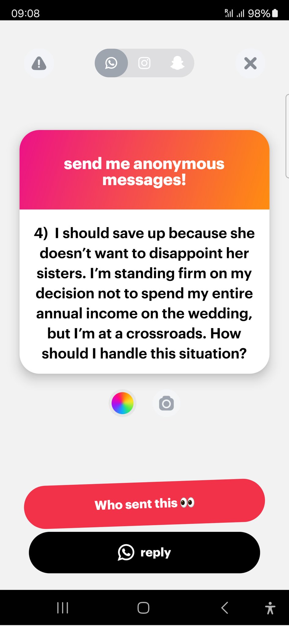 I should save up because she doesn’t want to disappoint her sisters. I’m standing firm on my decision not to spend my entire annual income on the wedding, but I’m at a crossroads. How should I handle this situation?”