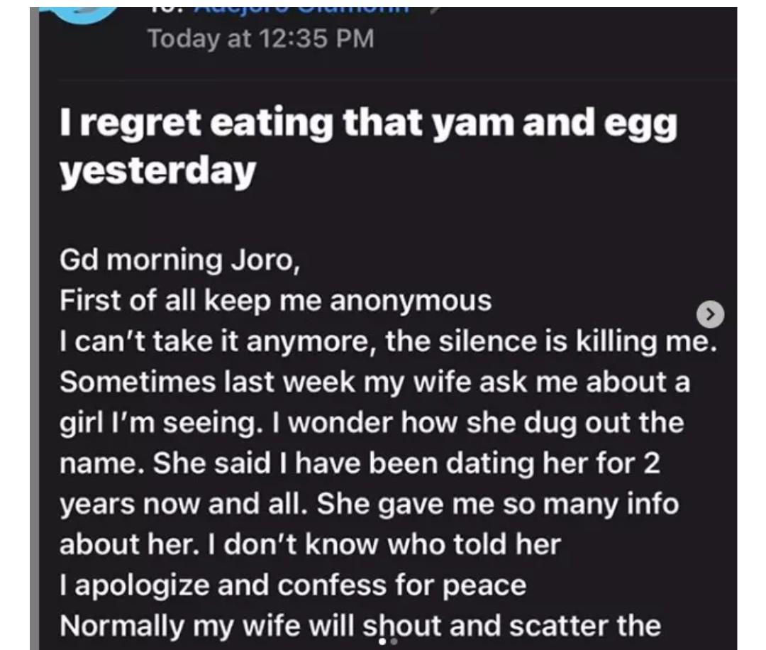 He sent a message to relationship expert, Joro Olomofin, explaining his case, and seeking for advice.
