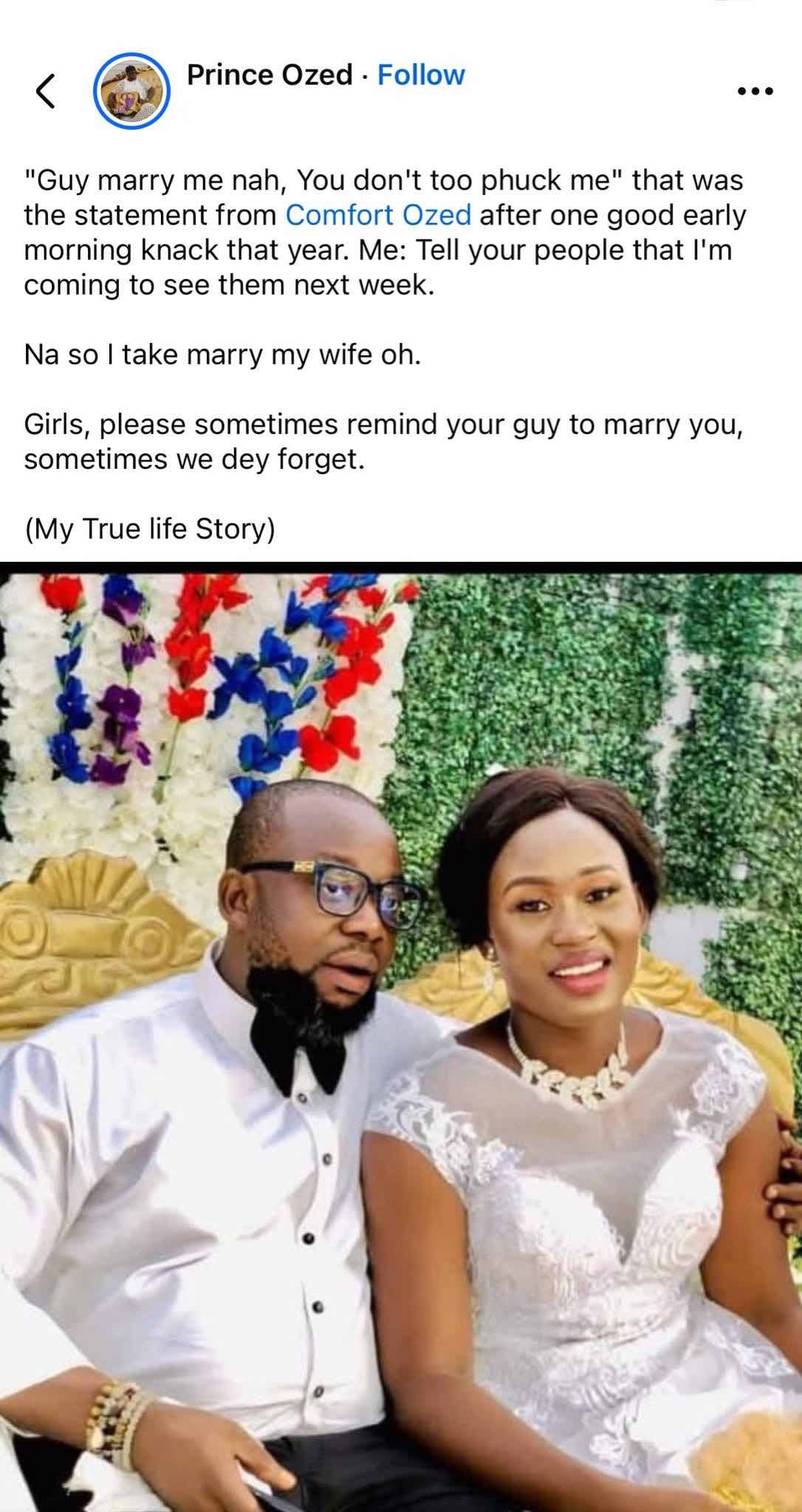In his post, Prince Ozed on Facebook recounted an intimate moment that led to their marriage even though the idea of settling down had not crossed his mind.