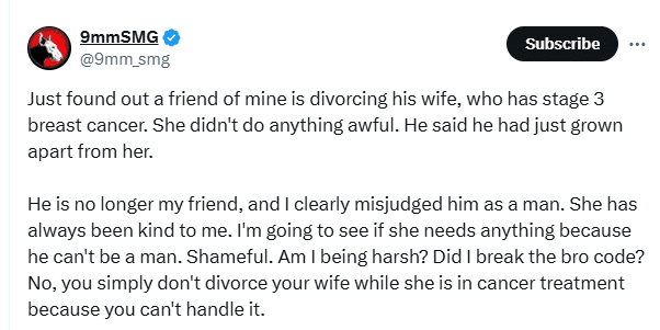 The man, @9mm_smg revealed that his friend’s wife is battling stage four breast cancer and wants to end his marriage with her.