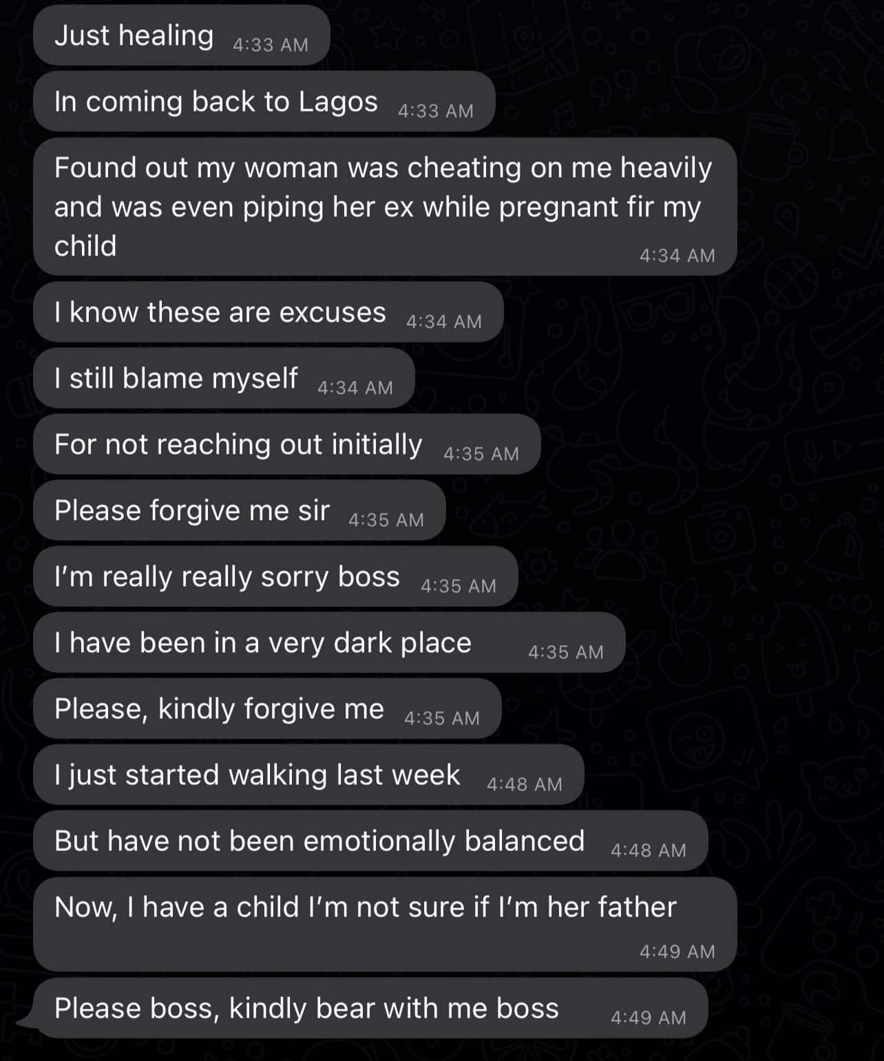 After weeks of no communication, an employee reaches out to his boss with an apology while narrating how he found out about his pregnant girlfriend’s affair with multiple partners.