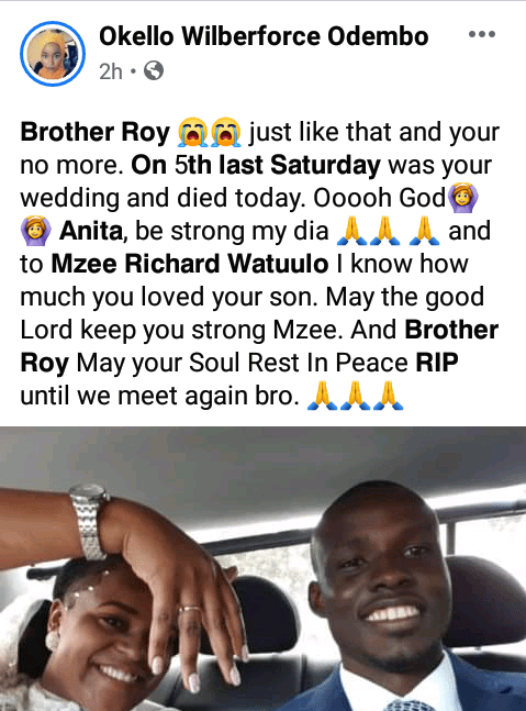 Reports say Roy Jairus Watuulo died in the early hours of Sunday, December 6, hours after he tied the knot with his wife, Anitah Nabuduwa on Saturday, December 5 in Kampala.