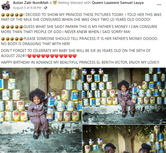 A Nigerian man Autan Zaki IkonAllah has taken to social media to showcase large tins of milk his daughter, El-Berith, consumed when she was just 2 years old.