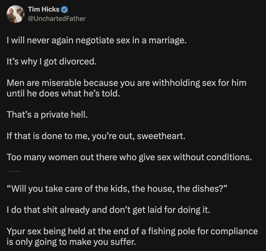 “I will never again negotiate sex in a marriage. It’s why I got divorced. Men are miserable because you are withholding sex for him until he does what he’s told.