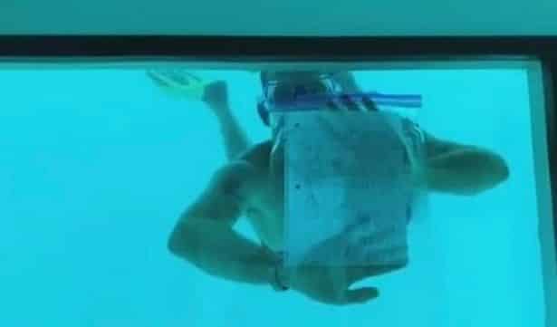 The video shows Steven swimming underwater and holding a zipper storage bag with a hand written note inside.