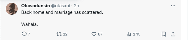 Man dumps marriage with his wife as they relocate back to Nigeria because she failed to pass her master’s degree program abroad; regrets not marrying his intelligent ex-girlfriend.
