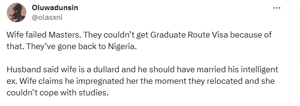 “Wife failed Masters. They couldn’t get Graduate Route Visa because of that. They’ve gone back to Nigeria.