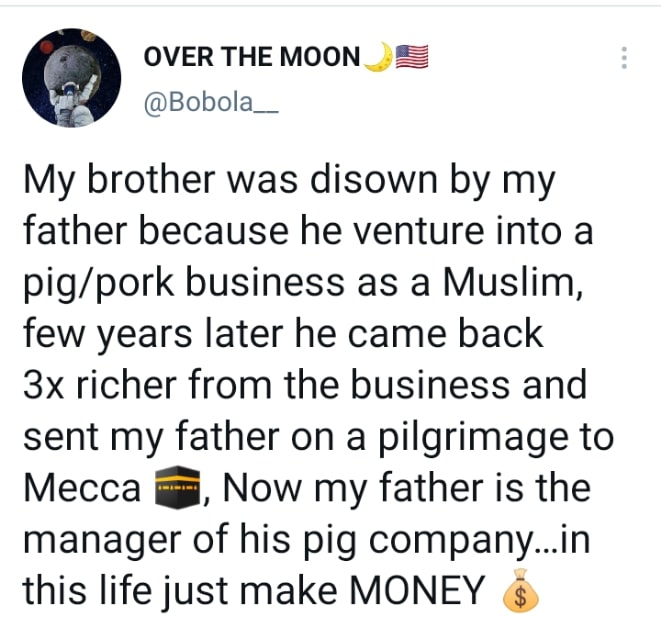 “My brother was disown by my father because he venture into a pig/pork business as a Muslim, few years later he came back 3x richer from the business and sent my father on a pilgrimage to Mecca 🕋, Now my father is the manager of his pig company…in this life just make MONEY 💰.”