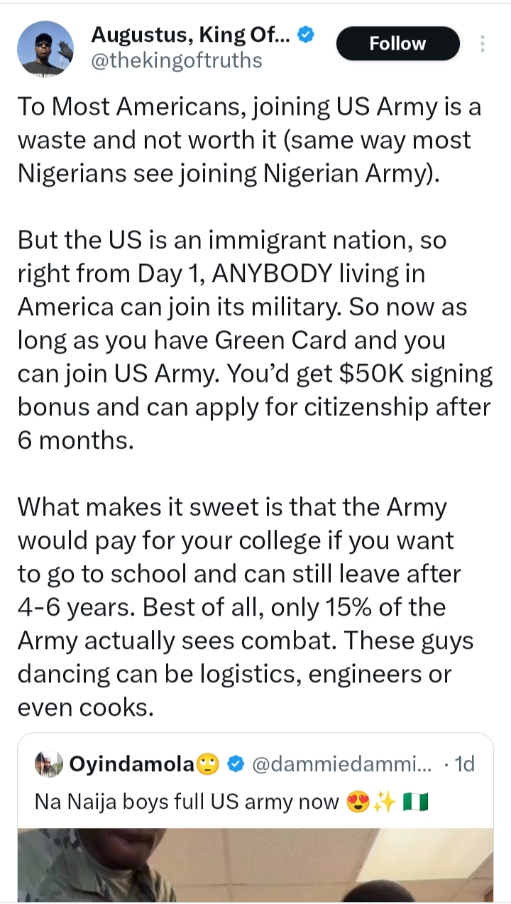 A social media user, Augustus, known as “King of Truth,” has shared insights into why an increasing number of Nigerians are enlisting in the United States Army.