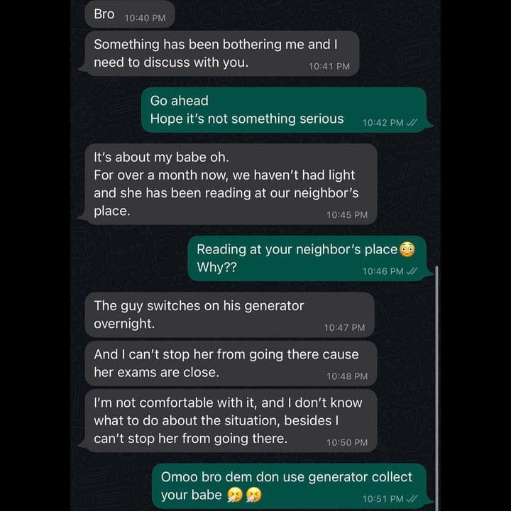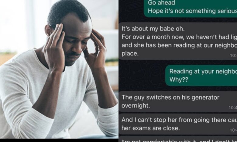 In a WhatsApp chat which surfaced online, the unnamed man told his friend that they hadn’t had light for some time now, and his girlfriend now goes to her their neighbor’s to study since he leaves his generator to run way into the night.