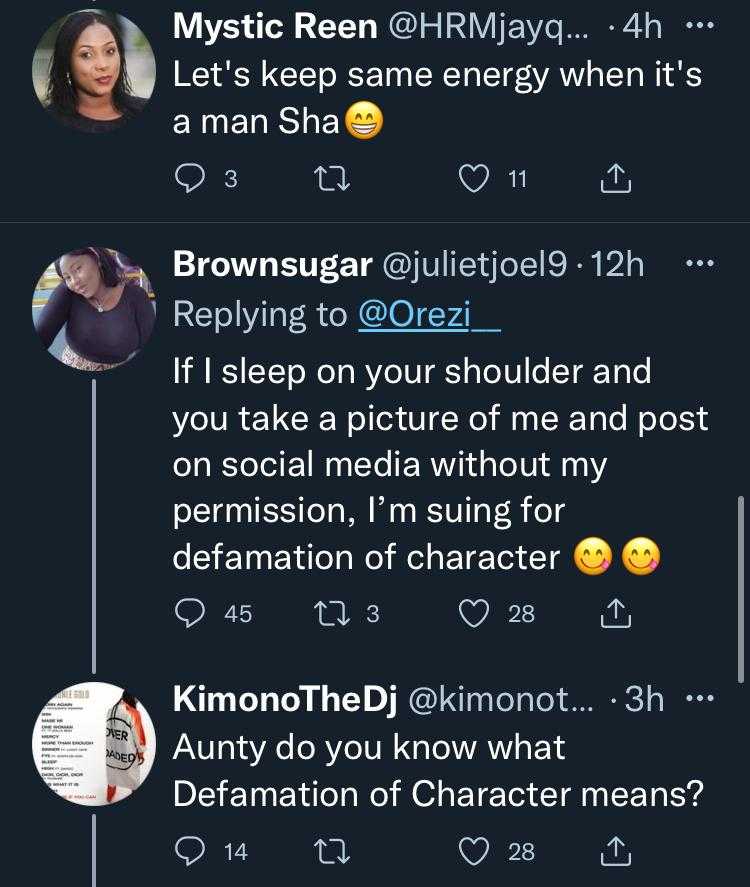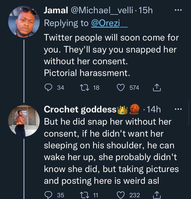“If I sleep on your shoulder and you take a picture of me and post on social media without my permission, I’m suing for defamation of character,” a concerned user wrote.