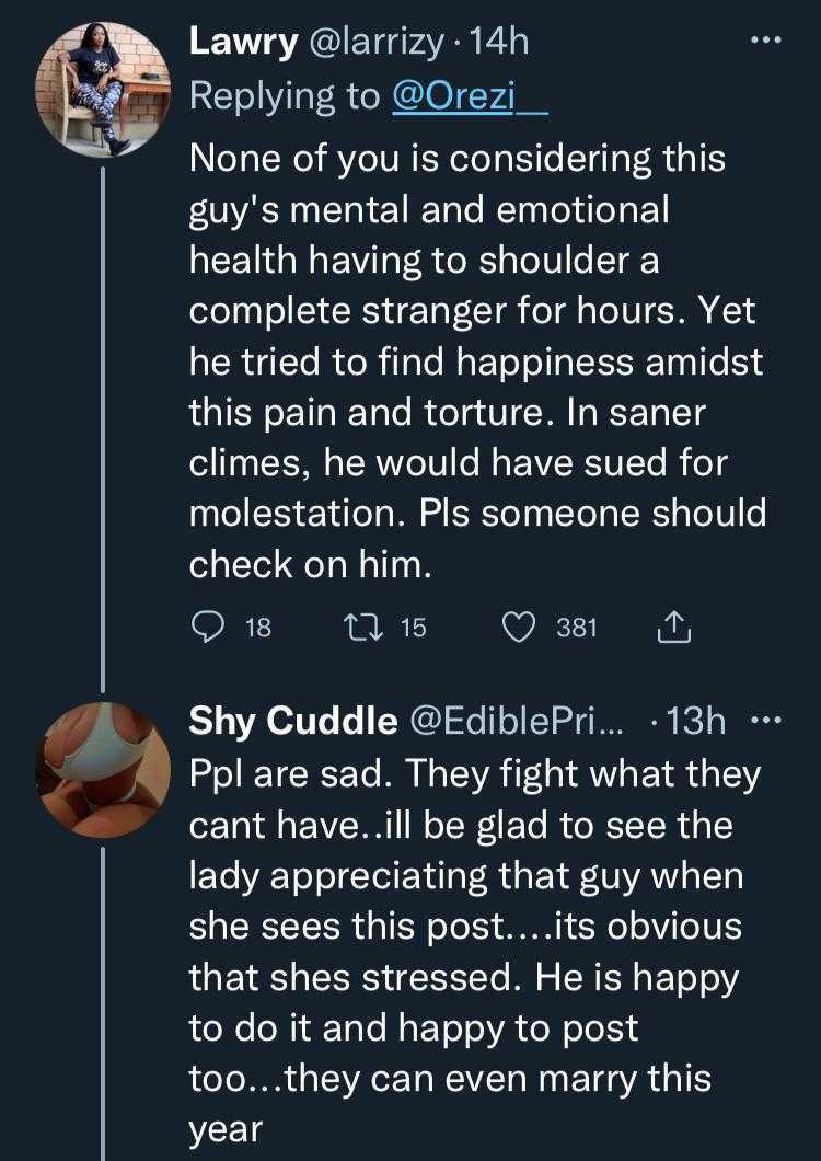 “I don’t know this lady and she’s comfortably resting on my shoulder ? she looks stressed ? rest your head baby girl ??,” he wrote while sharing the photos.