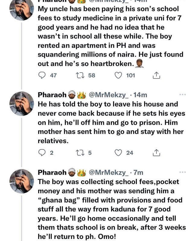 “My uncle has been paying his son’s school fees to study medicine in a private uni for 7 good years and he had no idea that he wasn’t in school all these while. The boy rented an apartment in PH and was squandering millions of naira. He just found out and he’s so heartbroken.🤦🏾