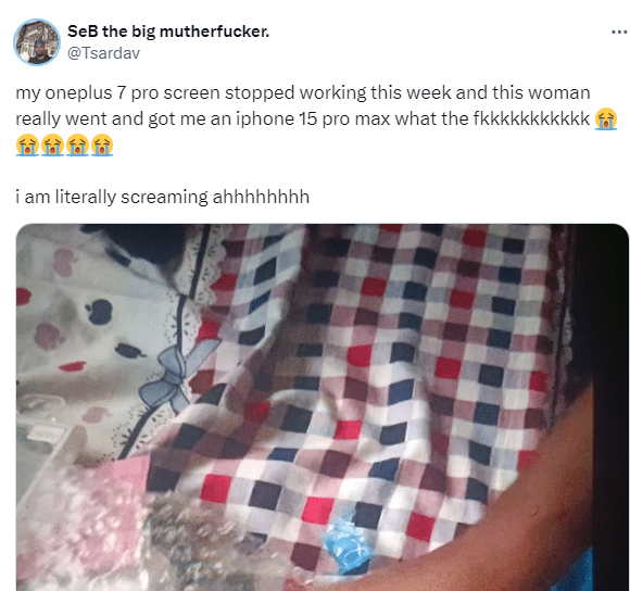 “My oneplus 7 pro screen stopped working this week and this woman really went and got me an iphone 15 pro max what the fkkkkkkkkkkk 😭😭😭😭😭 I am literally screaming ahhhhhhhh.”