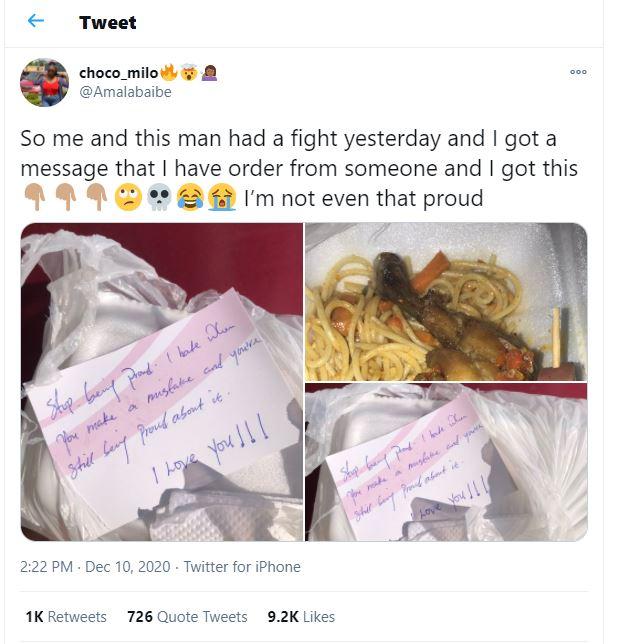 If you are not comfortable with my reply, go and sleep..the guy is cheap for thinking a common spaghetti and meat is a good gift to cheer his babe up with. I said it and I’m not regretting shitssss.”