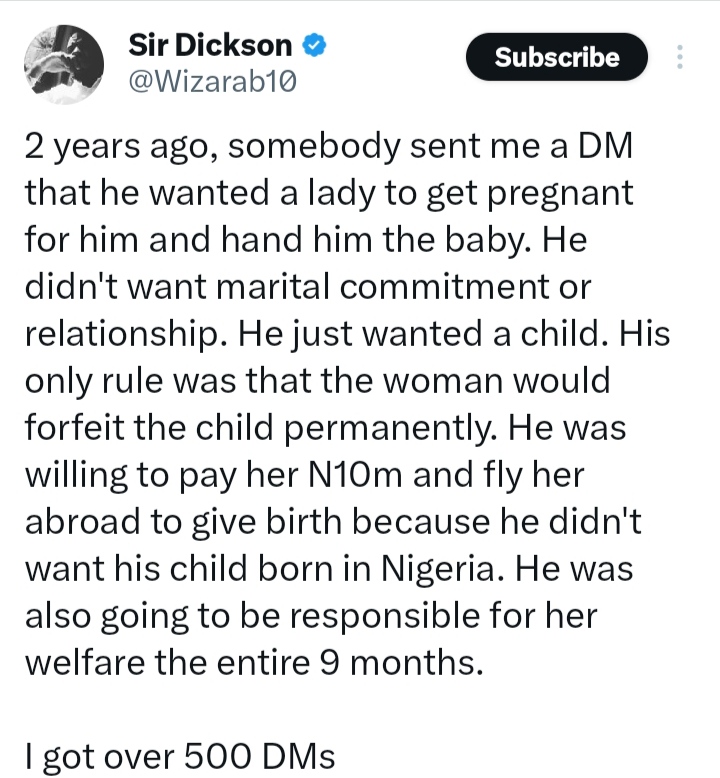 “2 years ago, somebody sent me a DM that he wanted a lady to get pregnant for him and hand him the baby. He didn’t want marital commitment or relationship. He just wanted a child. His only rule was that the woman would forfeit the child permanently. He was willing to pay her N10m and fly her abroad to give birth because he didn’t want his child born in Nigeria. He was also going to be responsible for her welfare the entire 9 months.