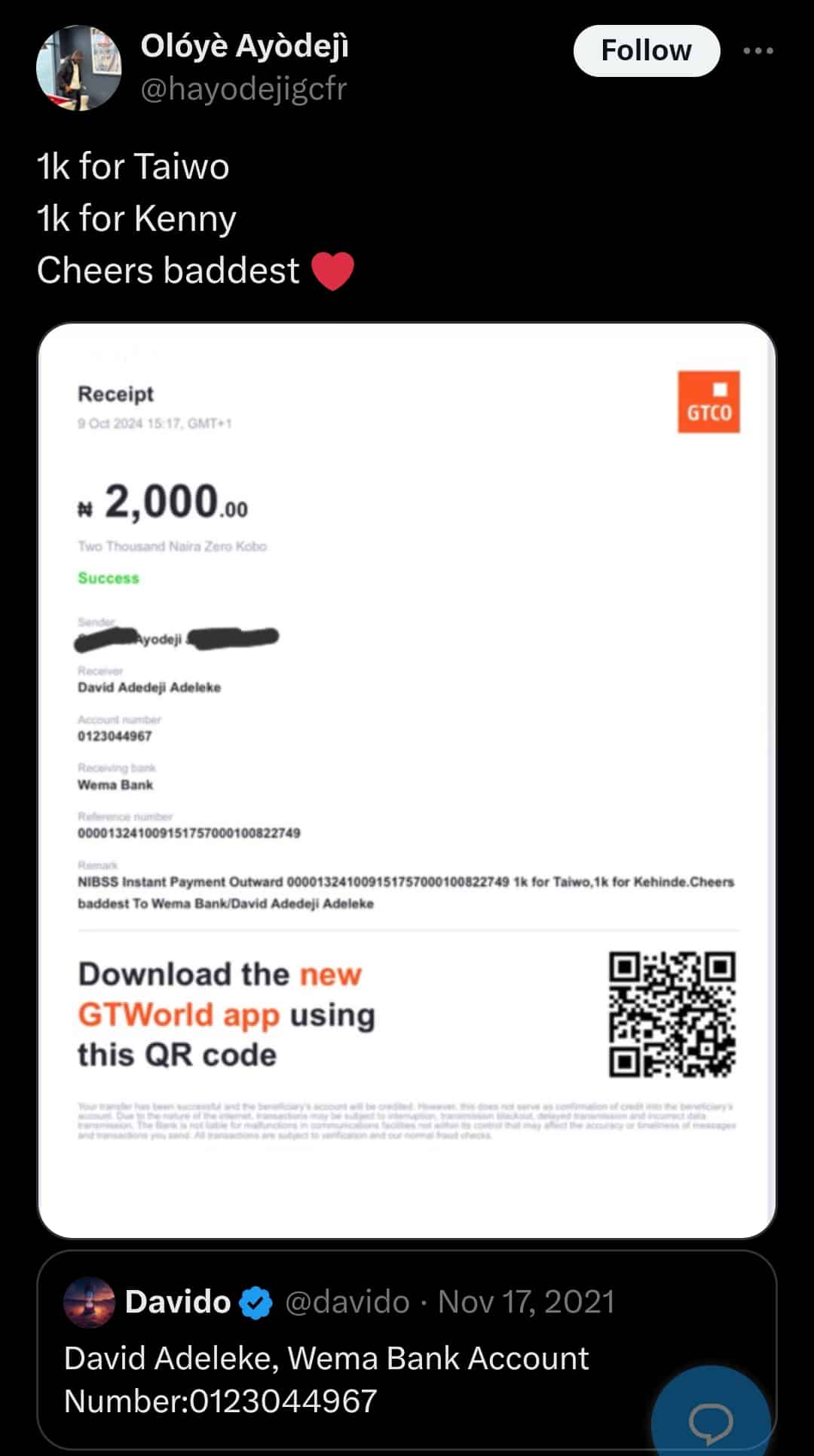 In a post shared on his social media account via X, formerly known as Twitter, the man referenced an old tweet from Davido that contained the singer’s bank account details, along with a receipt to confirm the transfer.