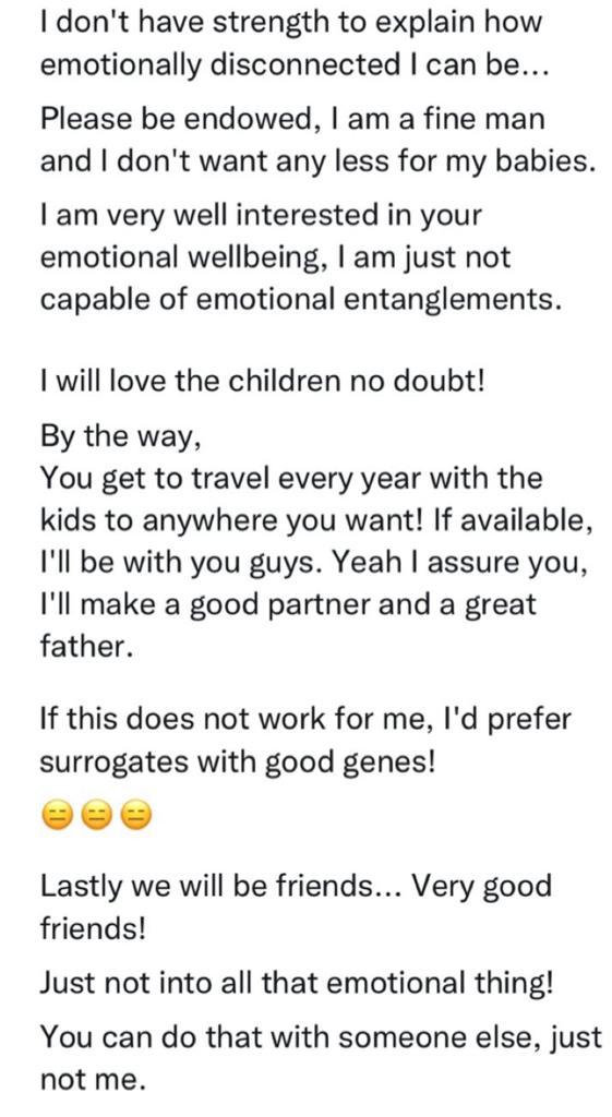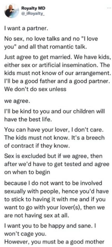 “I want a partner. No sex, no love talks and no “I love you” and all that romantic talk. Just agree to get married. We have kids, either sex or artificial insemination. The kids must not know of our arrangement. I’ll be a good father and a good partner. We don’t do sex unless
