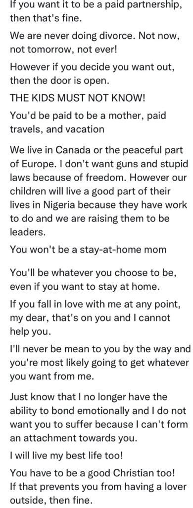 You can have your lover, I don’t care. The kids must not know. It’s a breech of contract if they know. Sex is excluded but if we agree, then after we’d have to get tested and agree on when to begin because I do not want to be involved sexually with people. hence you’d have to stick to having it with me and if you want to go with your lover(s), then we are not having sex at all. I want you to be happy and sane. I won’t cage you. However, you must be a good mother.