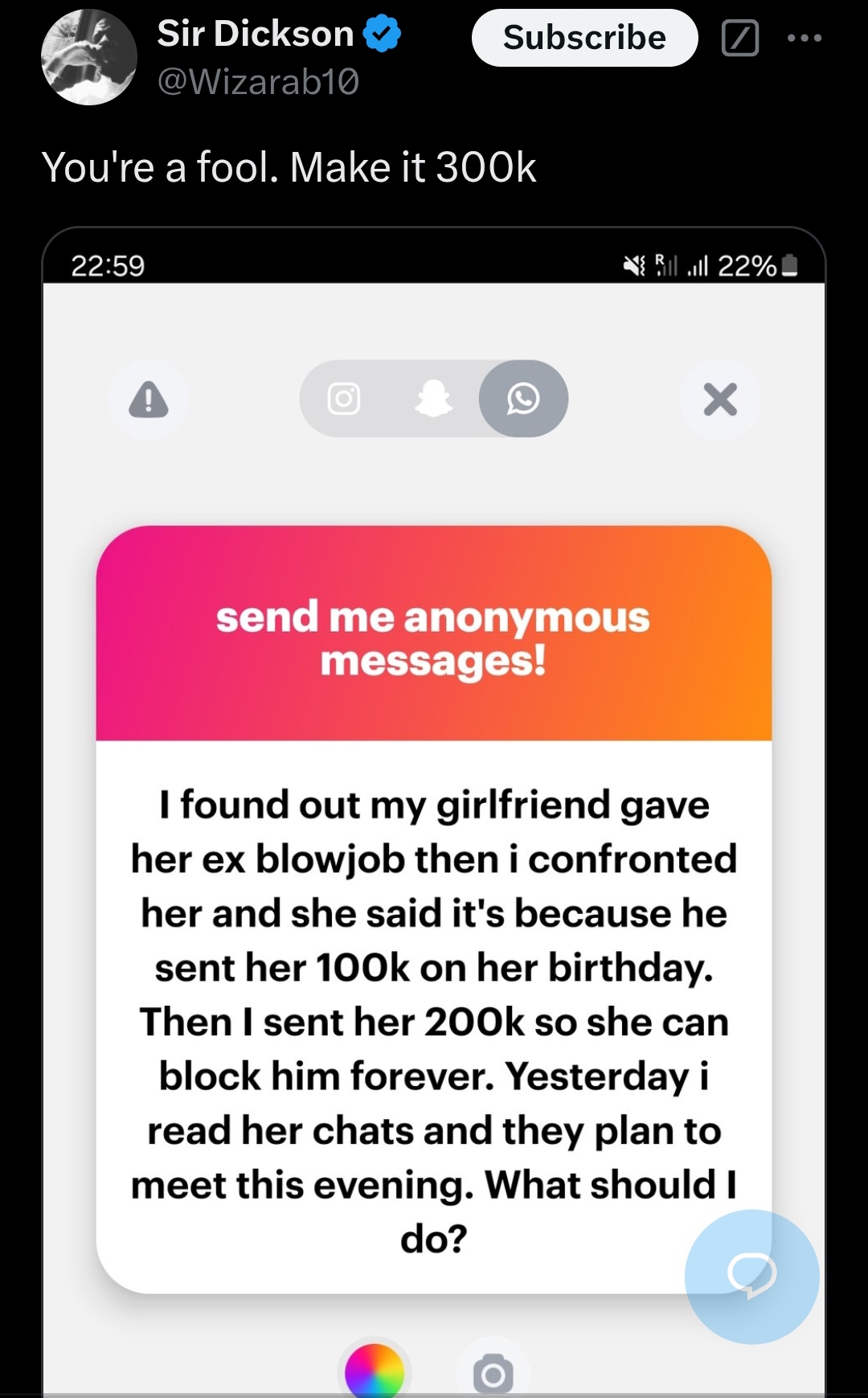 His statement read: “I found out my girlfriend gave her ex a blowjob. When I confronted her, she said it was because he sent her ₦100k for her birthday. So, I sent her ₦200k to make her block him forever. Yesterday, I read her chats, and they plan to meet this evening. What should I do?”
