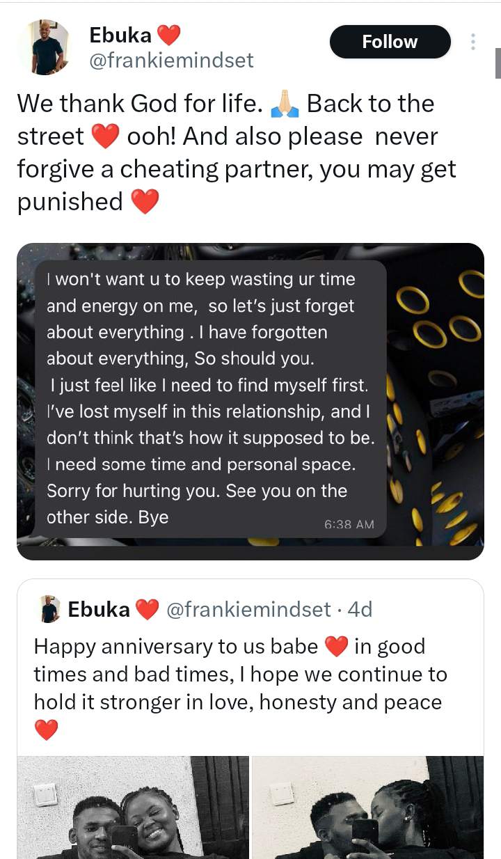 A Nigerian man has been left heartbroken as his girlfriend breaks up with him four days after they celebrated their anniversary.