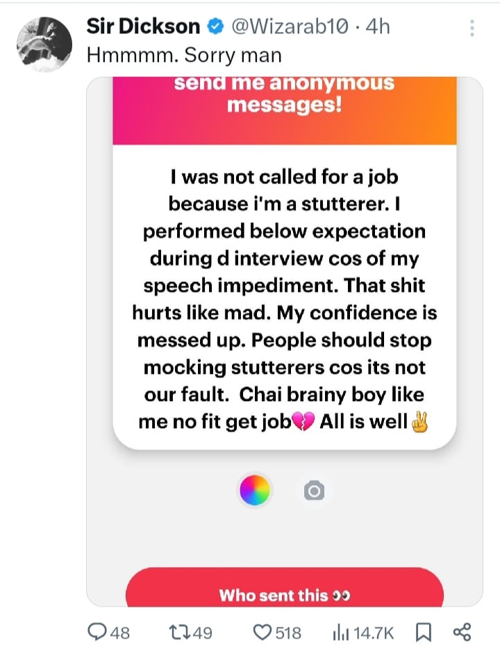 “I was not called for a job because i’m a stutterer. I performed below expectation during d interview cos of my speech impediment. That shit hurts like mad. My confidence is messed up. People should stop mocking stutterers cos its not our fault. Chai brainy boy like me no fit get job All is well”