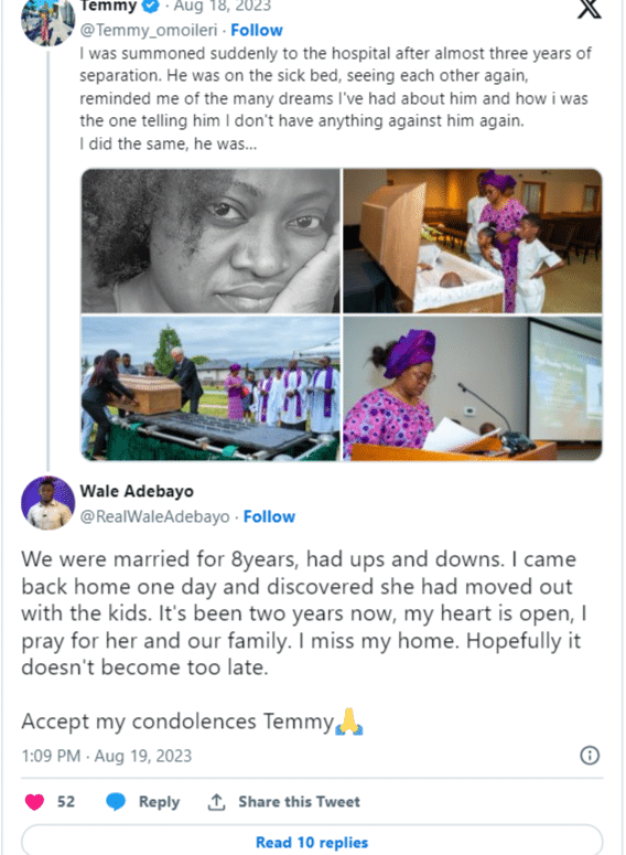 Wale’s disclosure came as he extended his condolences to another Twitter user, @Temmy_omoileri, who had recently lost her estranged husband.