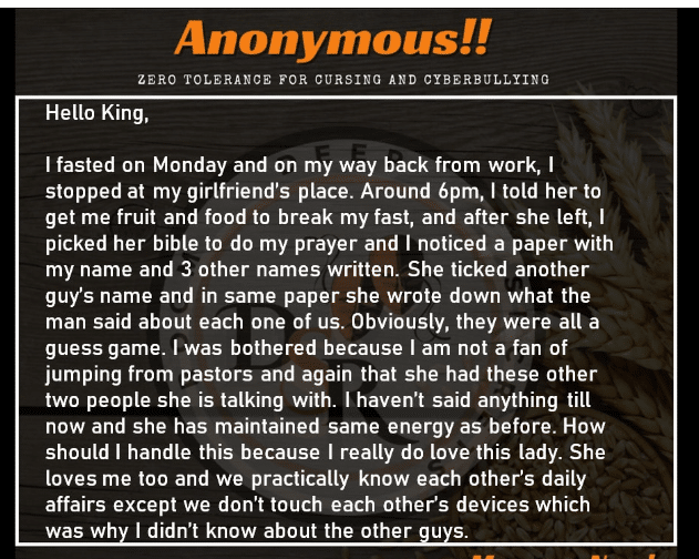 “I fasted on Monday and on my way back from work, I stopped at my girlfriend’s place. Around 6pm, I told her to get me fruit and food to break my fast, and after she left, I picked her bible to do my prayer and | noticed a paper with my name and 3 other names written. She ticked another guy’s name and in same paper she wrote down what the man said about each one of us. Obviously, they were alla guess game. I was bothered because I am not a fan of jumping from pastors and again that she had these other two people she is talking with. I haven’t said anything till now and she has maintained same energy as before. How should I handle this because I really do love this lady. She loves me too and we practically know each other’s daily affairs except we don’t touch each other’s devices which was why didn’t know about the other guys.”
