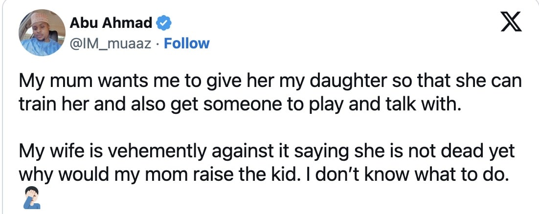 “My mum wants me to give her my daughter so that she can train her and also get someone to play and talk with. My wife is vehemently against it saying she is not dead yet why would my mom raise the kid. I don’t know what to do,” he wrote.
