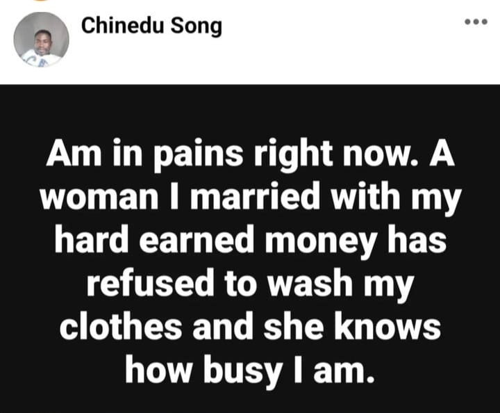 According to him, he married her and paid in full with his money and sees no reason she shouldn’t wash his clothes.