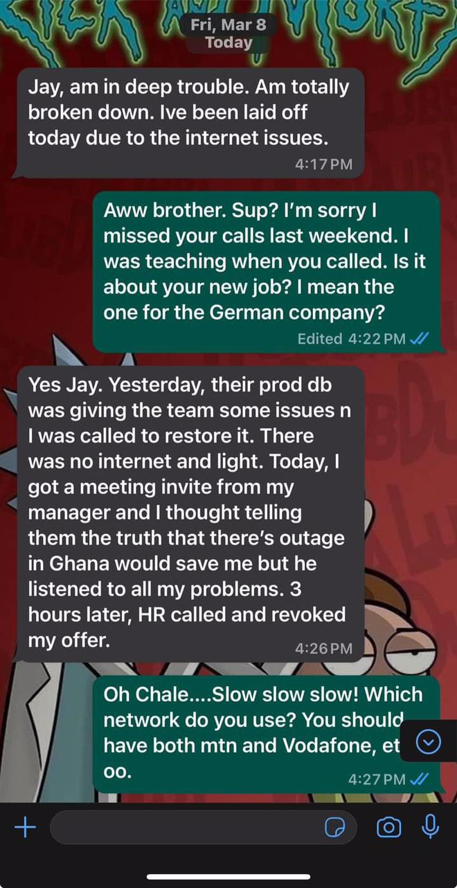 Sharing the chat on his wall, the friend of the man captioned it “The internet outage in Ghana has cost a professional colleague. He’s working for a German company from Ghana as their <withheld to protect his identity>. He started less than two months ago and still on probation. His contract got canceled today.