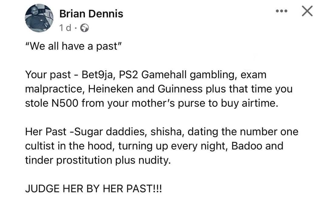 According to a Facebook user identified as Brian Dennis, some women who live their youthful age beyond limit deserve to be called to answer for their past than being accepted with open arms.