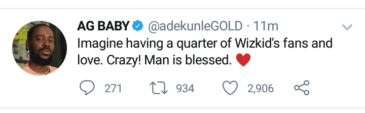 “Imagine having a quarter od Wizkid’s fans and love. Crazy! Man is blessed.”