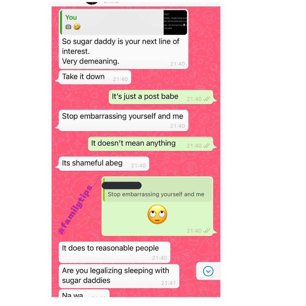 A young lady has heard the history of her life after sharing a post on her Whatsapp status that gives kudos to sugar daddies but condemn boyfriends.