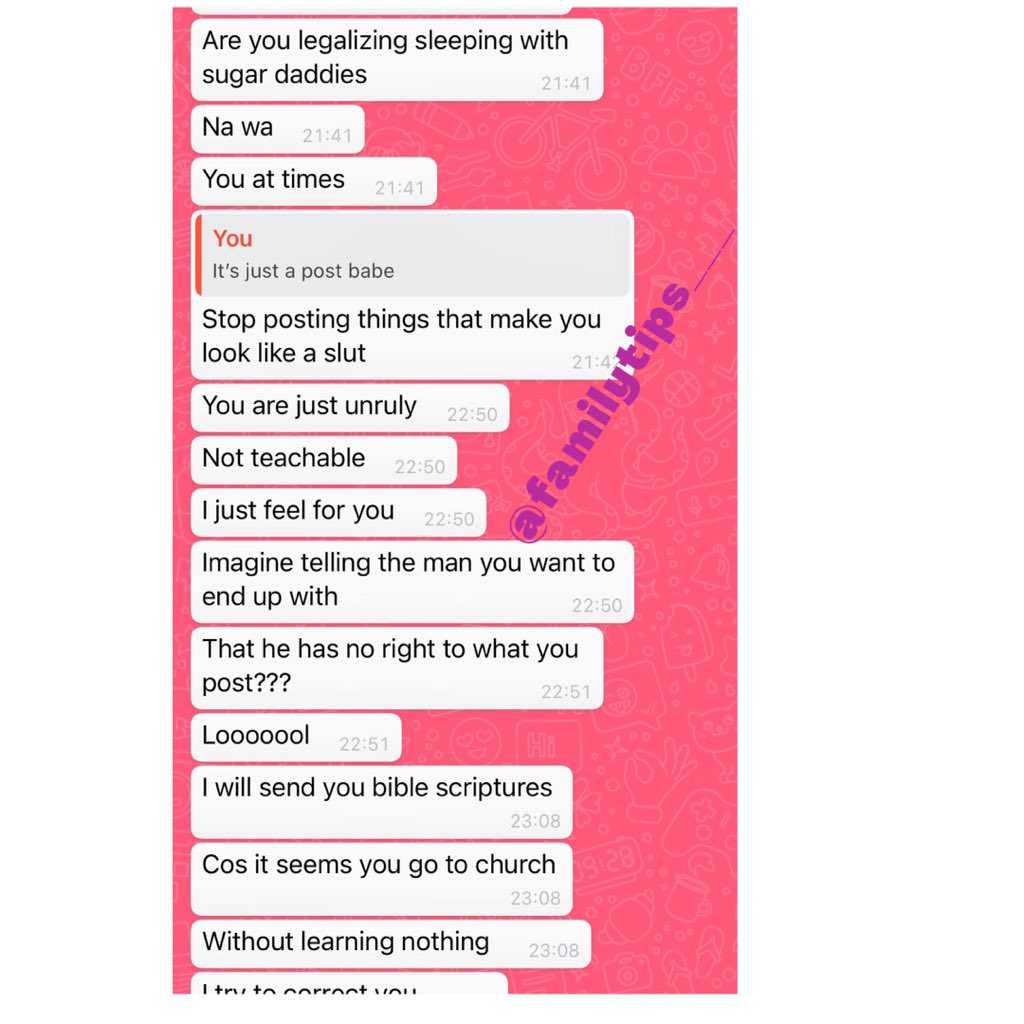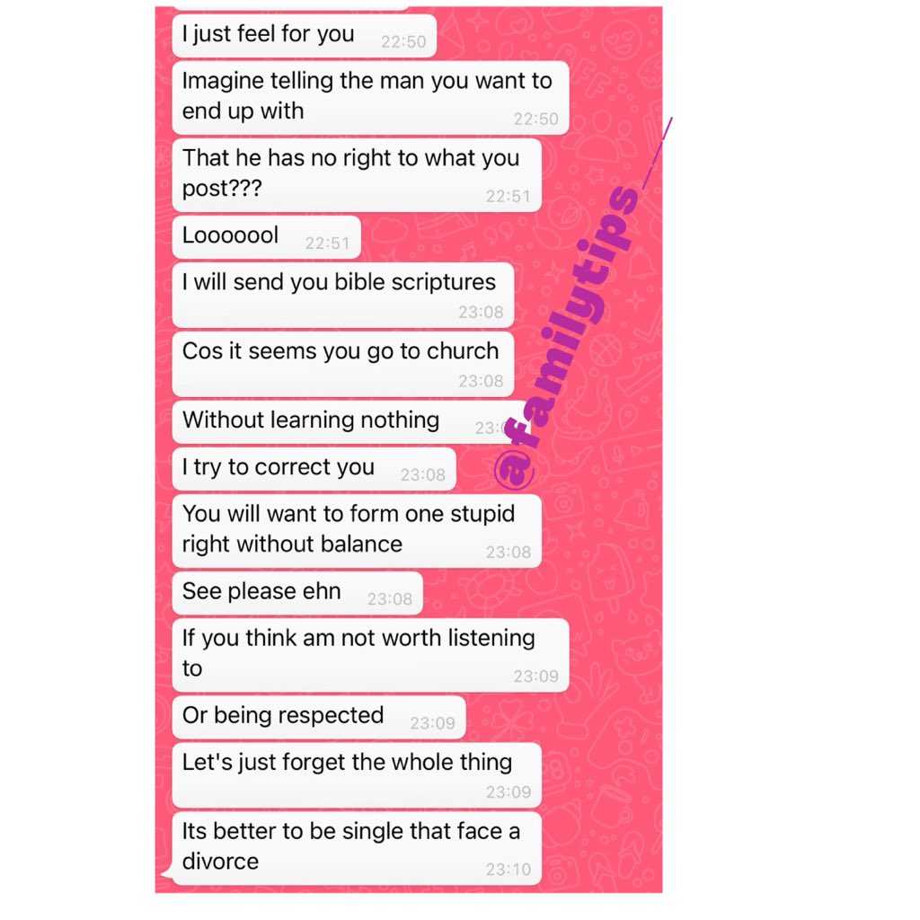 “You are just unruly, not teachable, I feel for you.” Face with rolling eyes This was purely just an opportunity to come at her, I don’t believe this is a healthy relationship that’s worth keeping.”