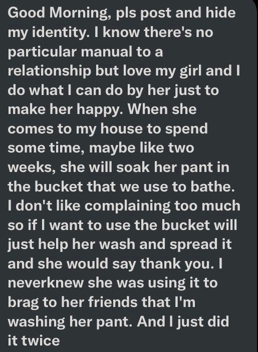 “Good Morning, pls post and hide my identity. I know there’s no particular manual to a relationship but love my girl and I do what I can do by her just to make her happy. When she comes to my house to spend some time, maybe like two weeks, she will soak her pant in the bucket that we use to bathe. I don’t like complaining too much so if I want to use the bucket will just help her wash and spread it and she would say thank you. I neverknew she was using it to brag to her friends that I’m washing her pant. And I just did it twice.