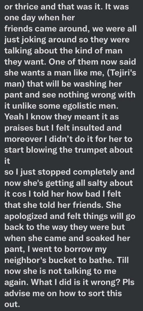 or thrice and that was it. It was one day when her friends came around, we were all just joking around so they were talking about the kind of man they want. One of them now said she wants a man like me, (Tejiri’s man) that will be washing her pant and see nothing wrong with it unlike some egolistic men. Yeah I know they meant it as praises but I felt insulted and moreover I didn’t do it for her to start blowing the trumpet about it so I just stopped completely and now she’s getting all salty about it cos I told her how bad I felt that she told her friends. She apologized and felt things will go back to the way they were but when she came and soaked her pant, I went to borrow my neighbor’s bucket to bathe. Till now she is not talking to me again. What I did is it wrong? Pls advise me on how to sort this out.”