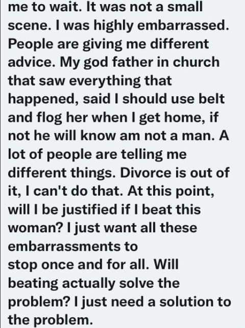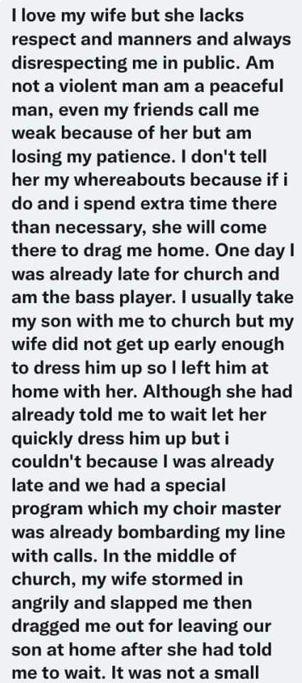 “I love my wife but she lacks respect and manners and always disrespecting me in public. Am not a violent man am a peaceful man, even my friends call me weak because of her but am losing patience. I don’t tell her my whereabouts because if I do I spend extra time there than necessary, she will come there to drag me home. One day I was already late for church…”