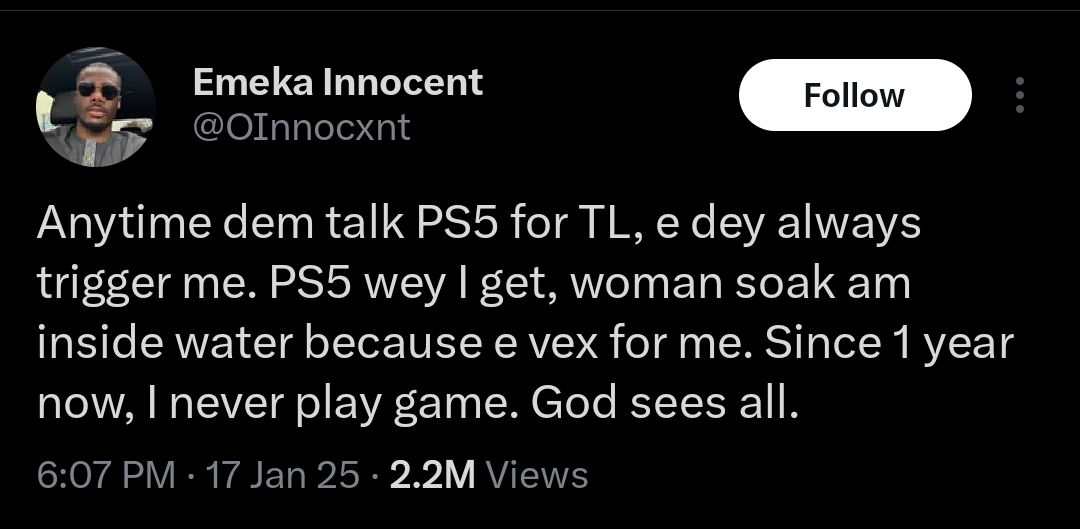 He wrote: “Anytime dem talk PS5 for TL, e dey always trigger me. PS5 wey I get, woman soak am inside water because e vex for me. Since 1 year now, I never play game. God sees all.”